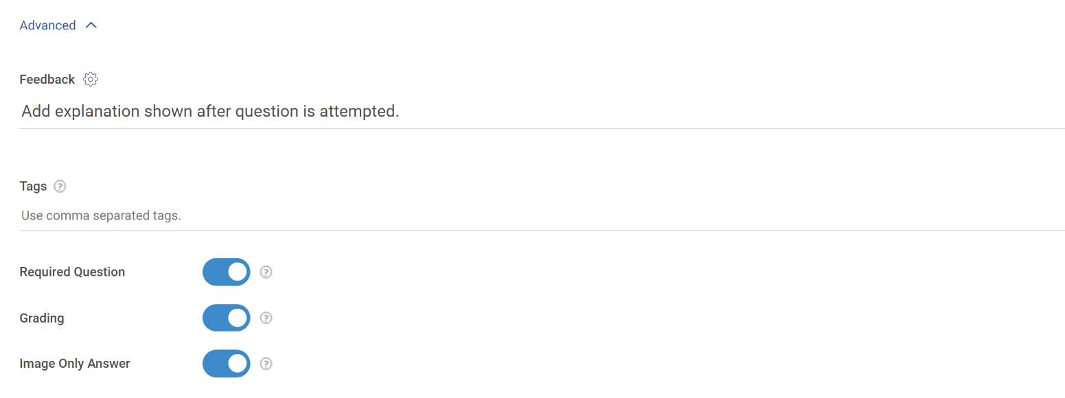 To add feedback, click Advanced at the bottom of your question, and in the space provided, type the feedback for the answer.