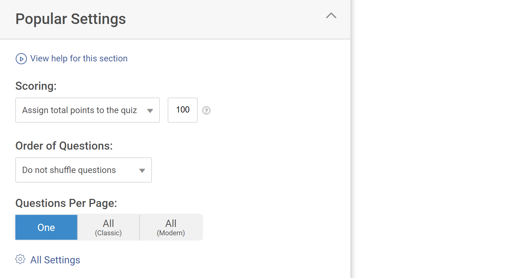 To assign scores, locate Popular Settings, open the dropdown menu, and select how you want to assign scores to your questions.