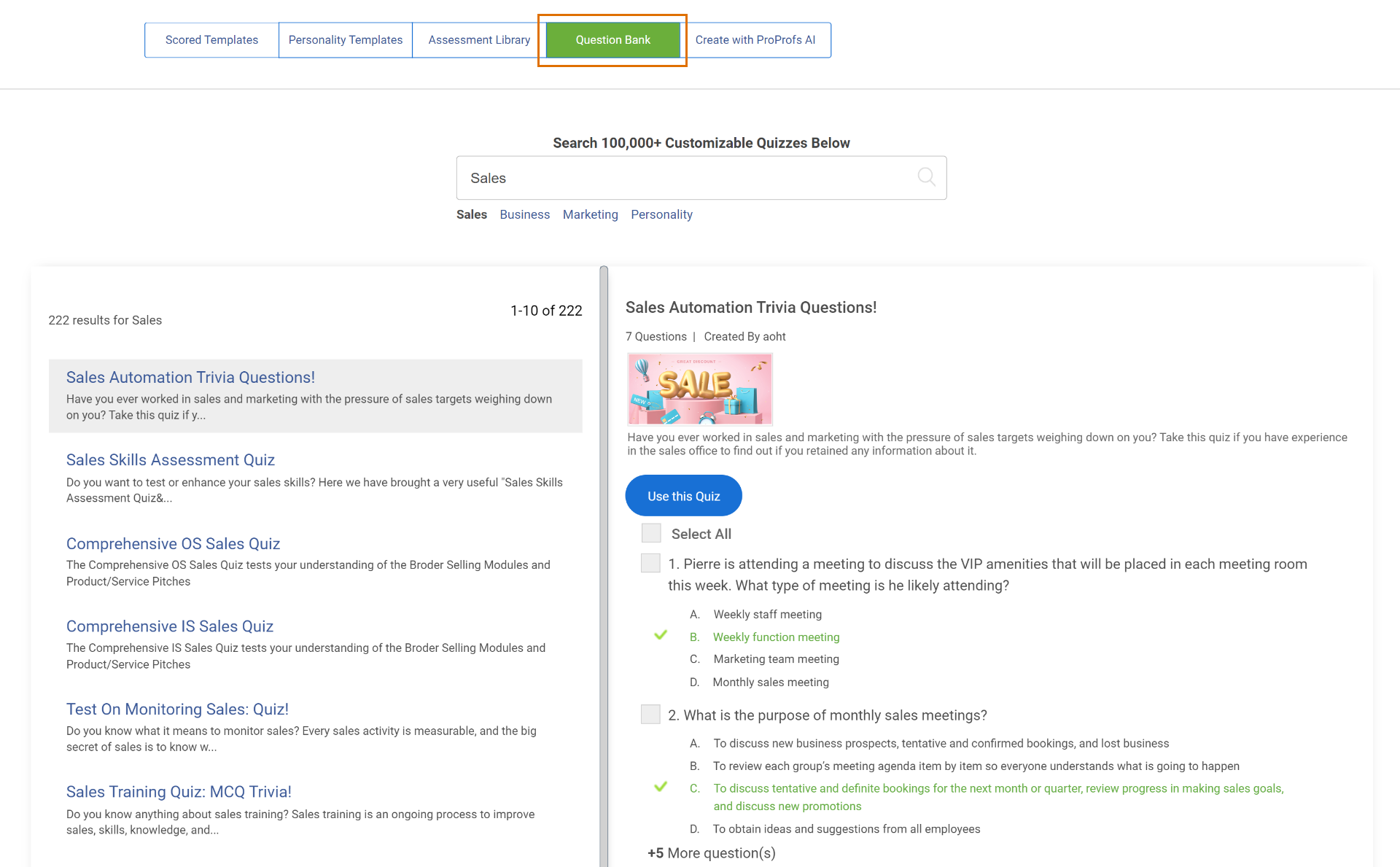 Similarly, you can access ready-to-use questions from the question bank. It’s a smarter and more efficient way to build online tests as it cuts down the time by many hours. For instance, there are at least 100k+ questions on thousands of topics in the ProProfs question bank that you can use.