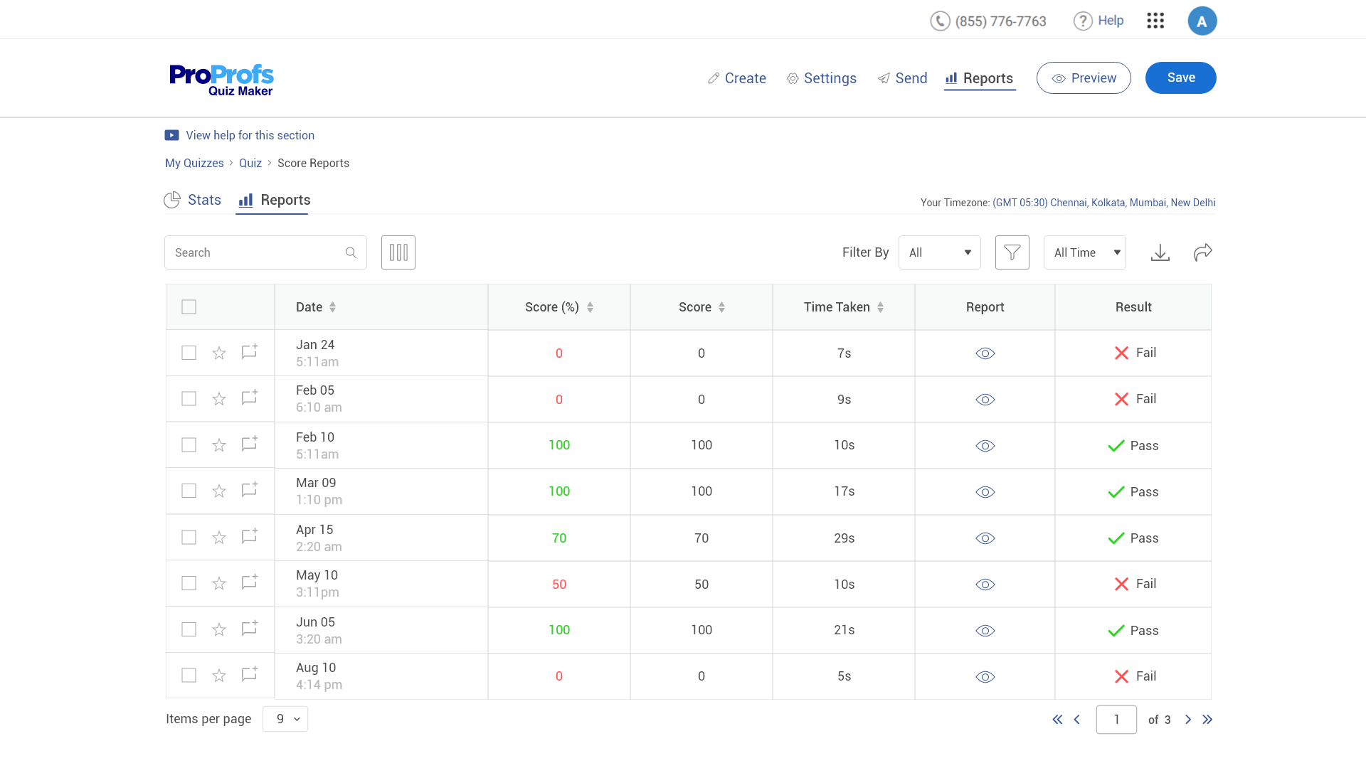 These reports will help you determine the knowledge gaps, question difficulty level, the average time to complete a quiz, and more.
