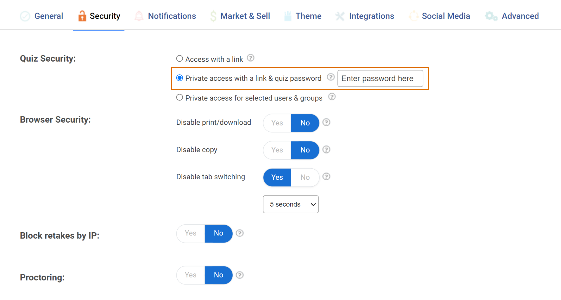 Configuring these settings is the best way to prevent cheating and unauthorized access. Additionally, you can configure other settings like quiz availability, notifications, integrations, and social media. Once you’re done configuring, click Save, and your test is ready.