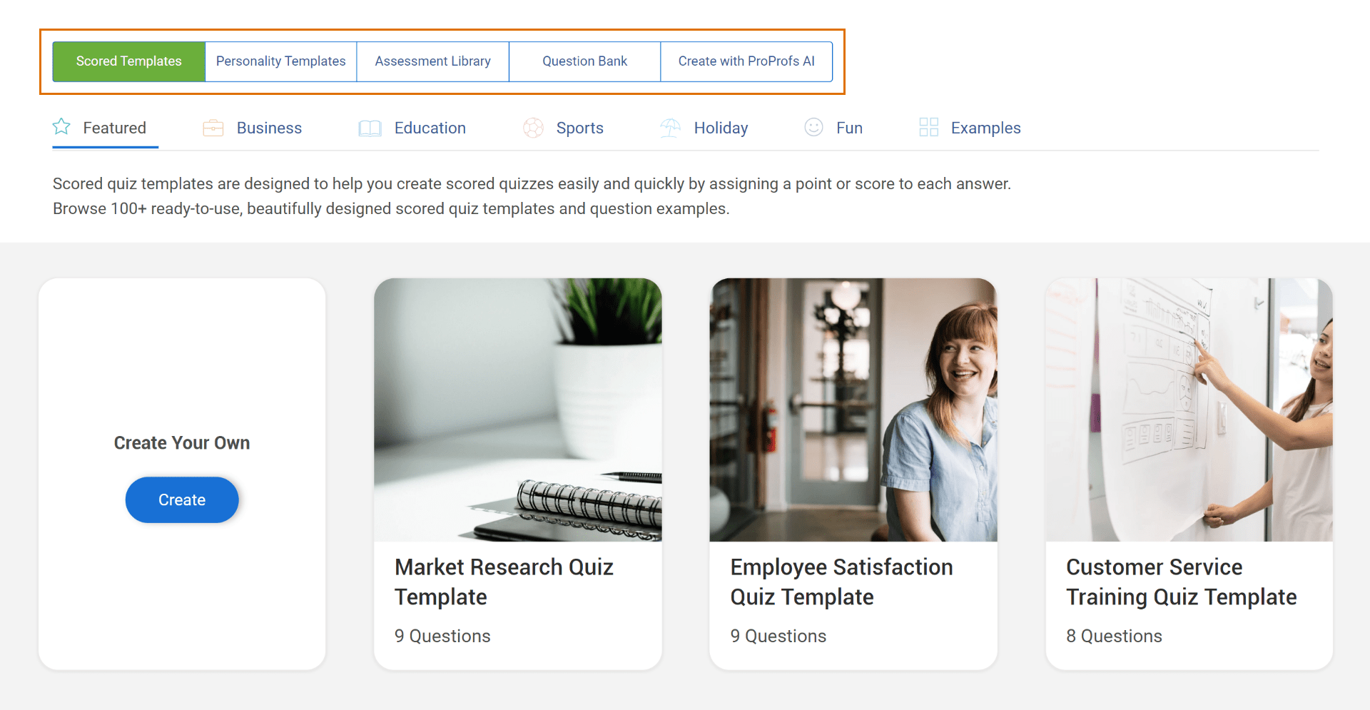 Choose any suitable template and edit it quickly to launch your test in minutes. For example, ProProfs offers 100+ scored quiz templates under different categories that you can use to build your tests.
