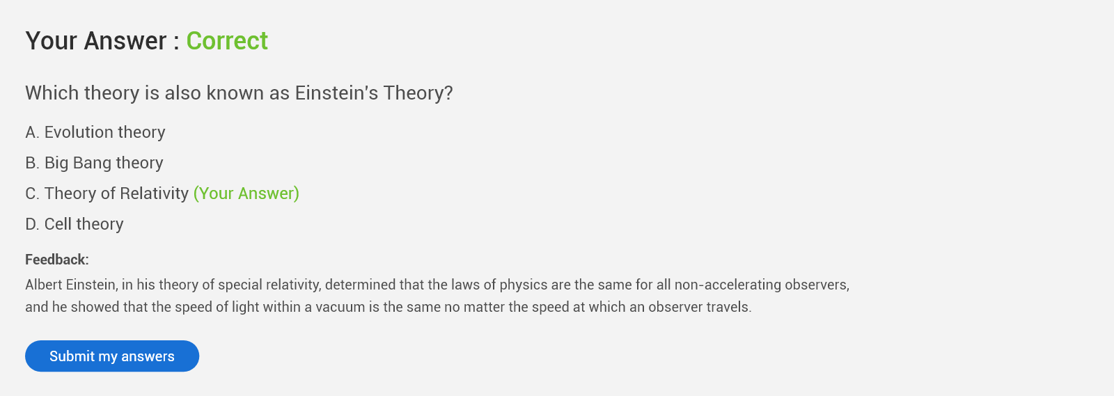 Provide learners with instant feedback (explanations) based on their answers. Providing instant feedback for each answer will help learners practice and attain mastery over a topic.