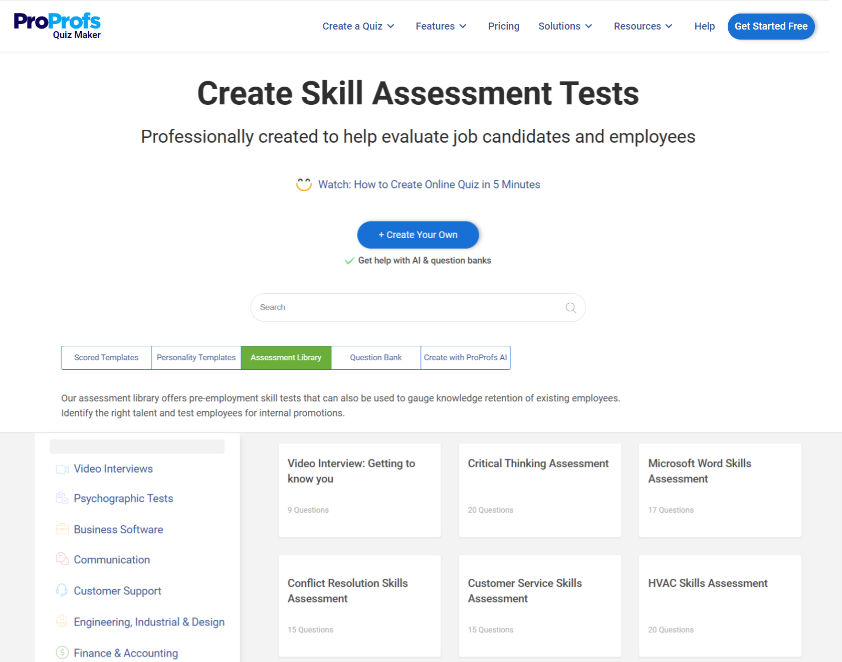 I’ve found ProProfs Quiz Maker to be the most comprehensive recruitment assessment tool out there. It allows me to create scored or personality quizzes on any topic easily and comes bundled with hundreds of the best pre-employment assessment tests that I can use as-is or modify to suit my needs.